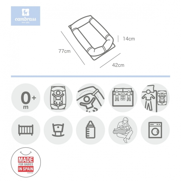 Le nid bébé réducteur de lit de Cambrass est un article multiusage conçu pour le confort de bébé dans les premiers mois de sa vie. Il est principalement utilisé pour protéger et rassurer le nouveau-né. Il peut être installé dans le lit des parents, dans un petit lit ou dans un berceau et son coussin extérieur peut servir de coussin d’allaitement.